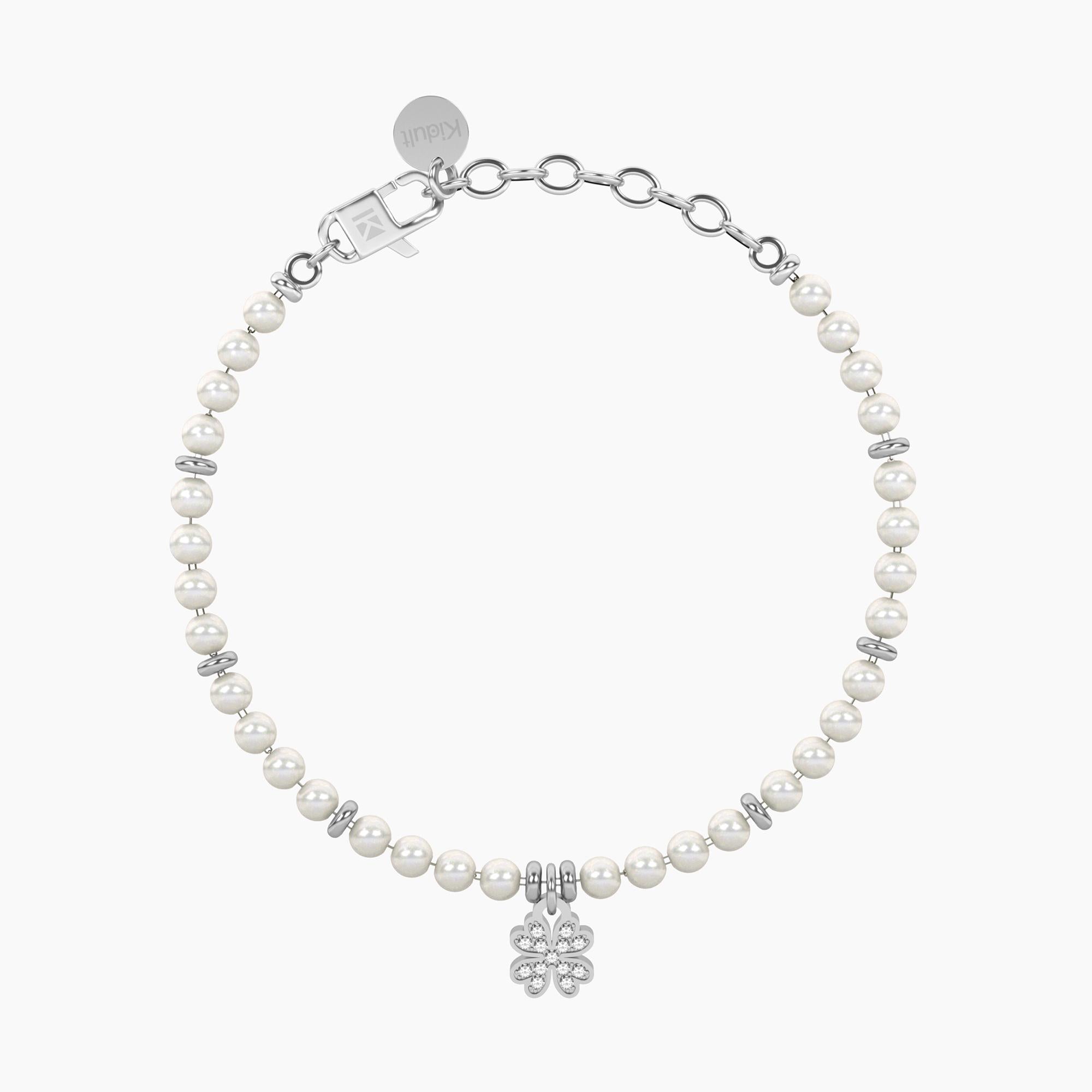 Bracciale da donna regolabile in acciaio con perle conchiglia e ciondolo a forma di quadrifoglio con cristalli.
