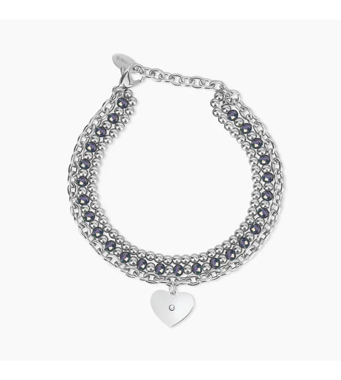 Bracciale in acciaio 316L con catena forzatina 3 mm, elementi da 2 mm, pendente cuore 13x11 mm, glass viola da 3 mm e cristallo 1.5 mm.