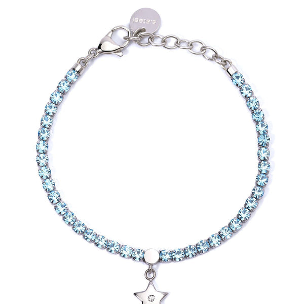 Bracciale tennis della collezione 2Jewels Youcolors da donna. Colore: argento e azzurri. Il gioiello è in acciaio inossidabile 316L impreziosito da cristalli azzurri e da un ciondolino a forma di stella con cristallo bianco posizionato al centro. Chiusura a moschettone.