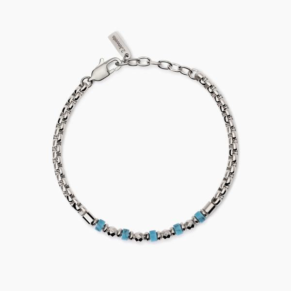 Bracciale in acciaio 316L con catena veneta 4 mm, elementi diamantati Ø 4 mm e dischi di turchese 2.5xØ4 mm, lunghezza regolabile da 18.5 a 21.5 cm.