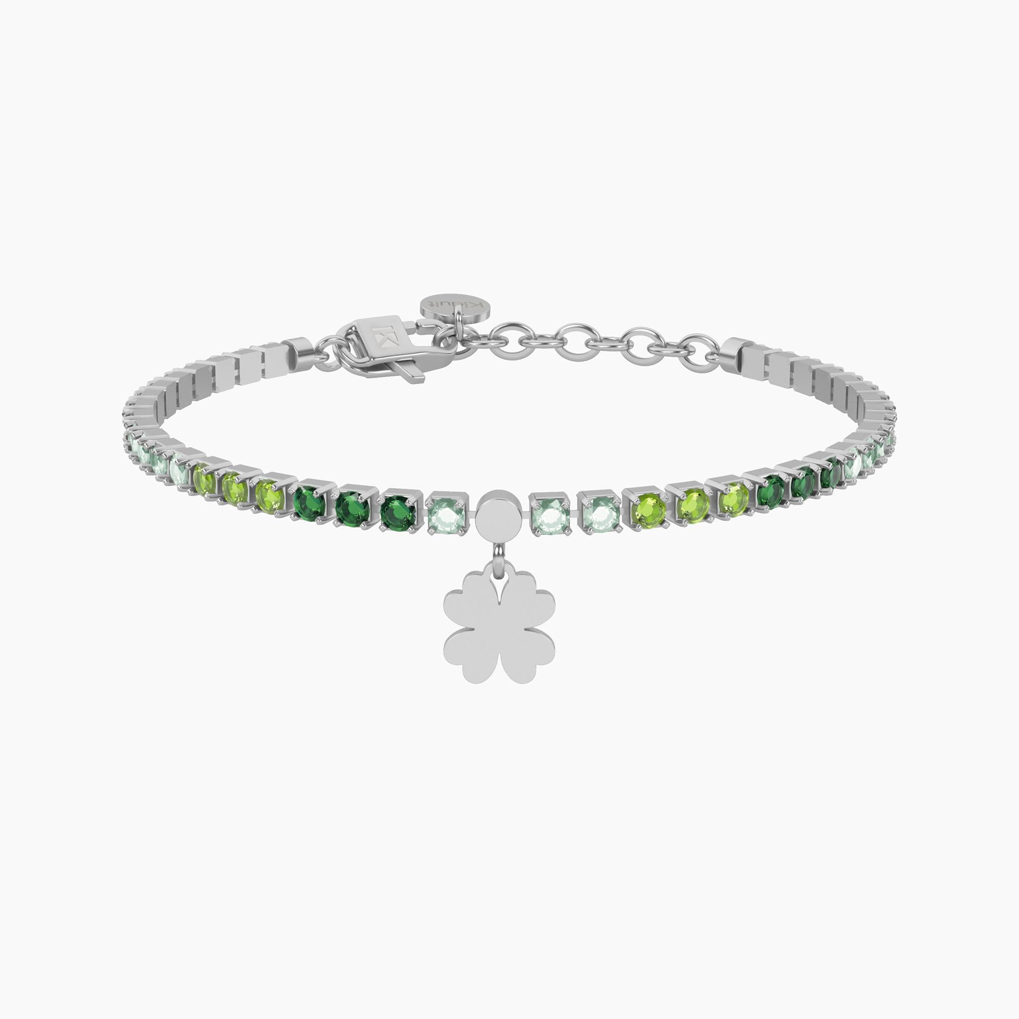Bracciale da donna regolabile in acciaio con tennis di cristalli multicolor e ciondolo a forma di quadrifoglio.