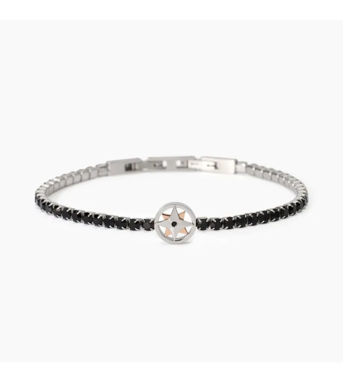 Bracciale tennis in acciaio 316L con elemento centrale rosa dei venti lucido e con PVD rosé da 12 mm e cristalli neri da 3 e 1.5 mm