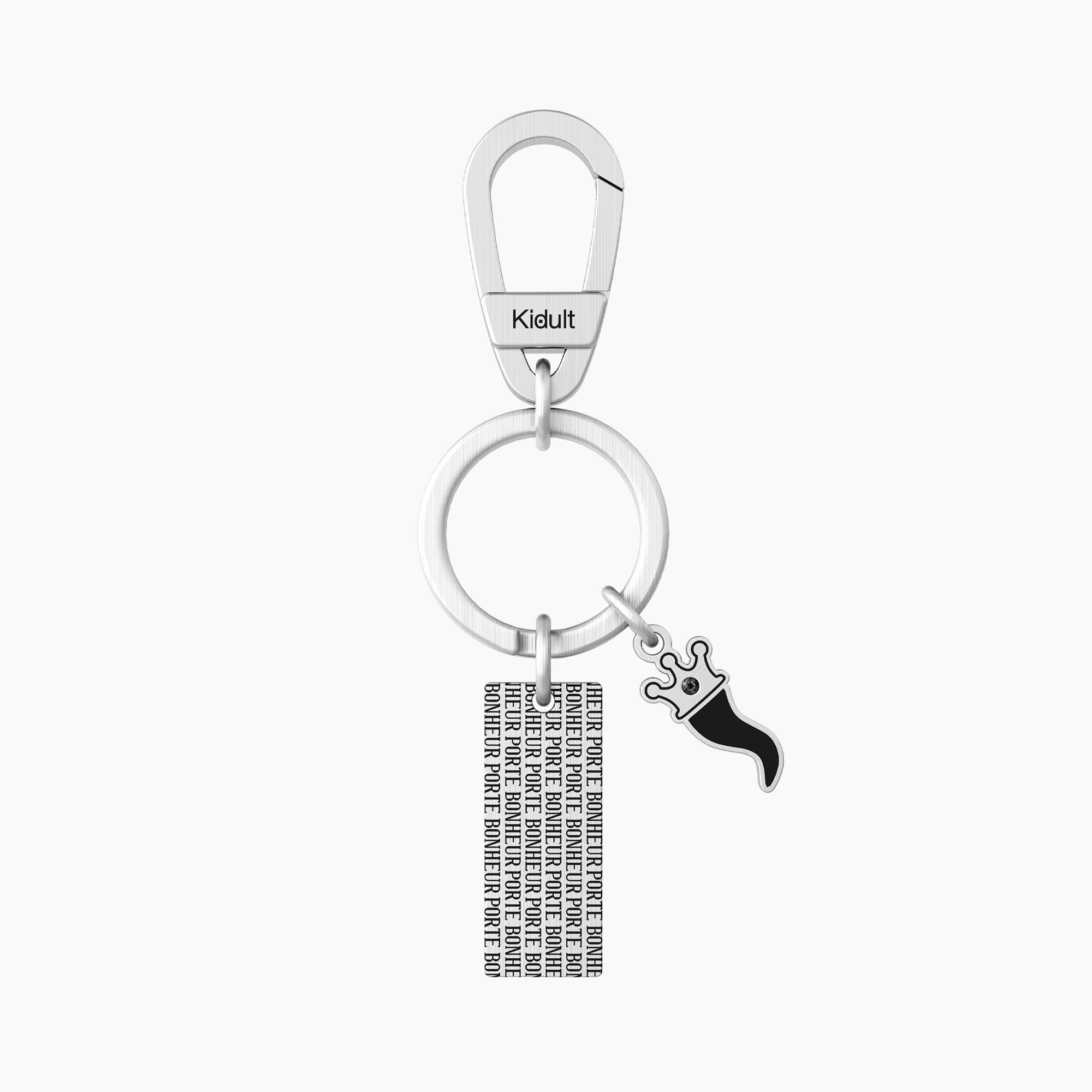 Portachiavi in acciaio satinato con ciondoli a forma di rettangolo con cristalli neri e scritta "Porte bonheur" e di cornetto in PVD nero con cristallo nero.