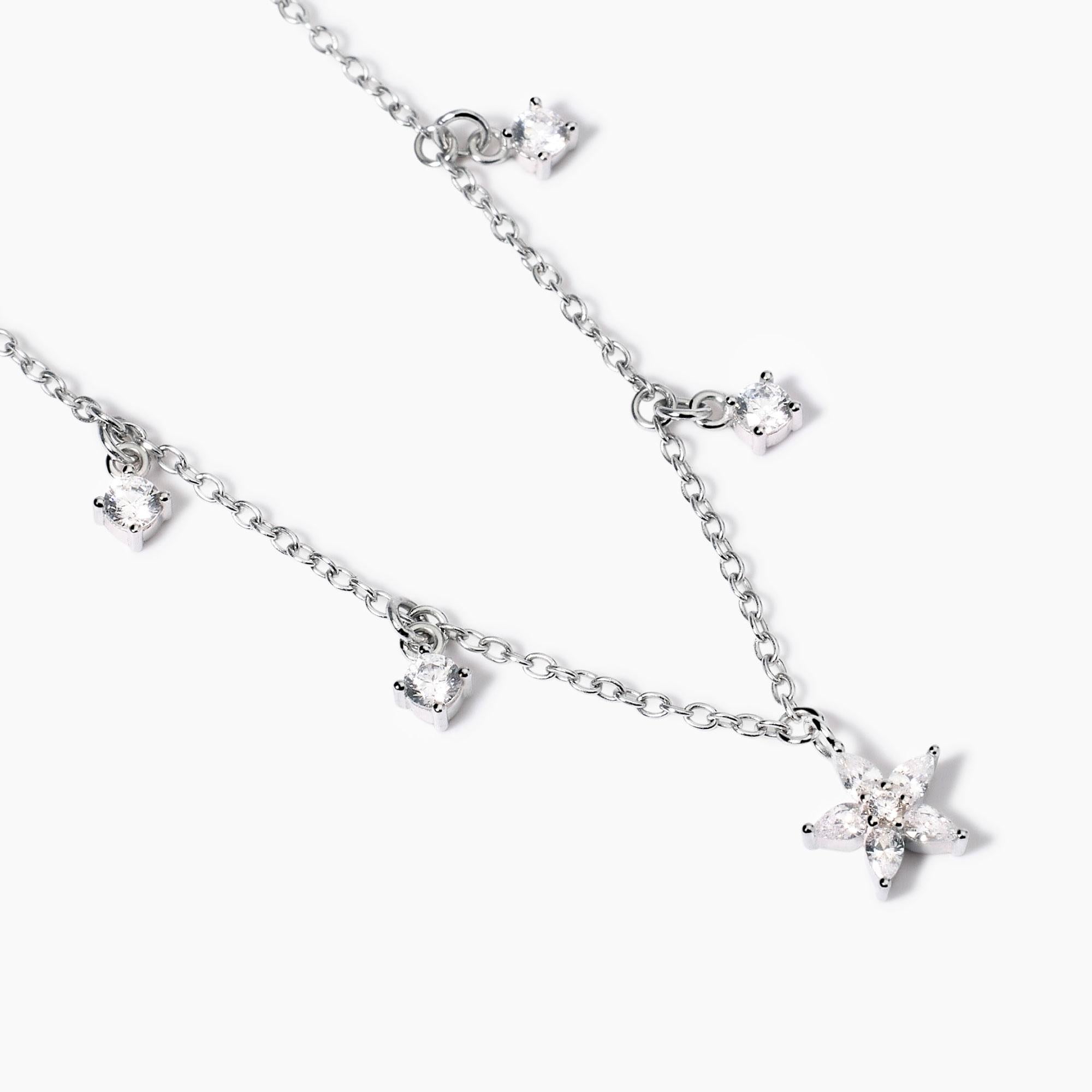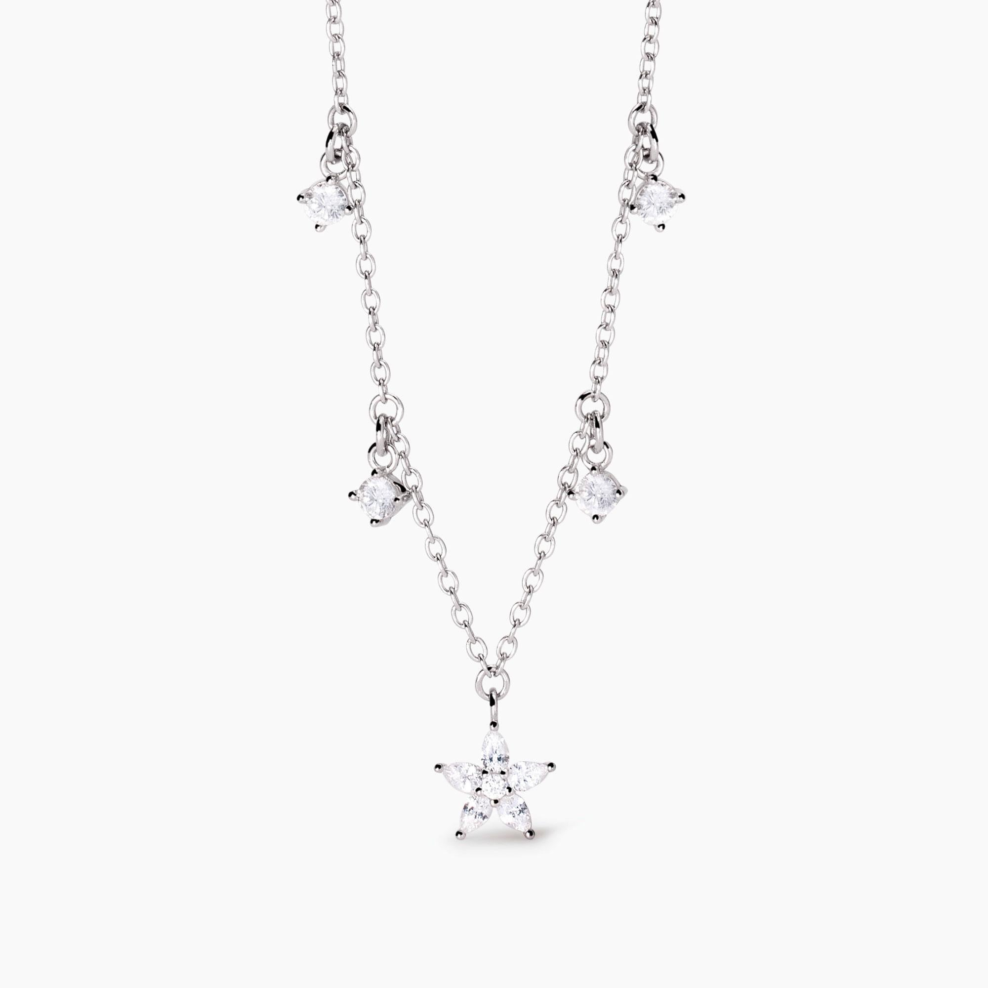 Girocollo regolabile da donna in argento rodiato con catena rolò, zirconi pendenti e ciondolo centrale a forma di fiore con zirconi taglio goccia.