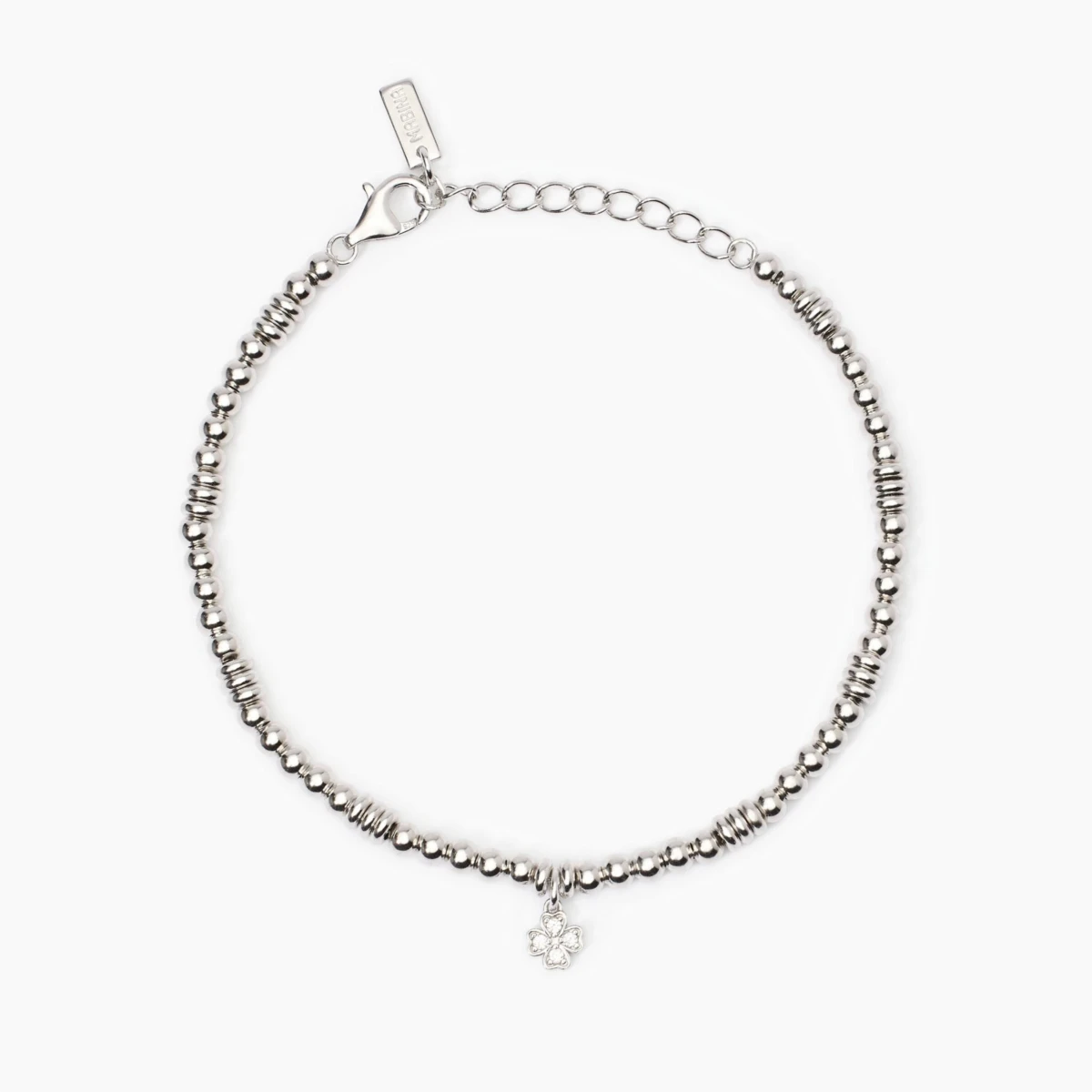 Bracciale da donna di Mabina della collezione Little Mix. Bracciale in argento 925/°°° rodiato con ciondolo centrale quadrifoglio 5x5 mm e zirconi diametro: 1.25 mm, lunghezza regolabile da 16 a 19 cm. La referenza è 533841.