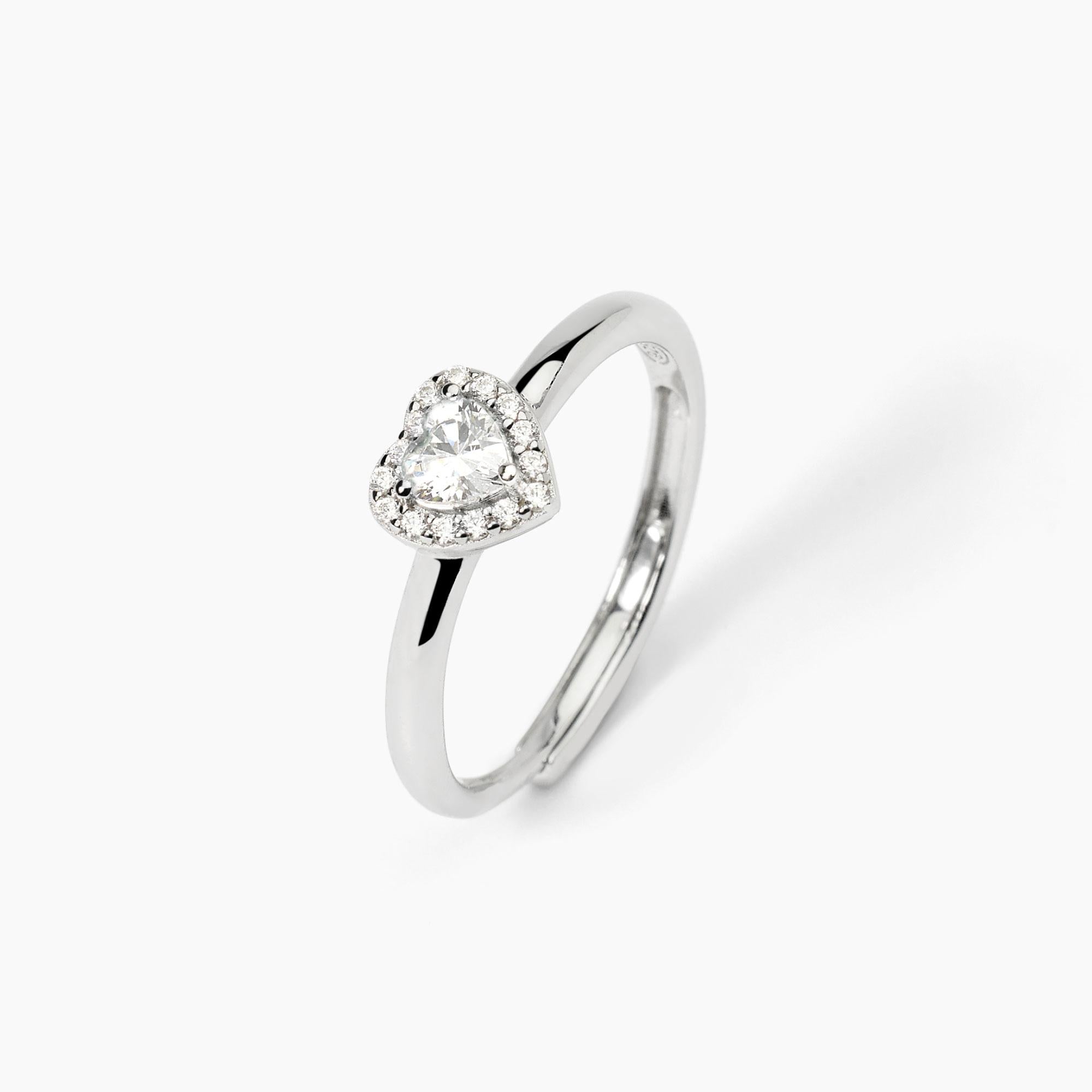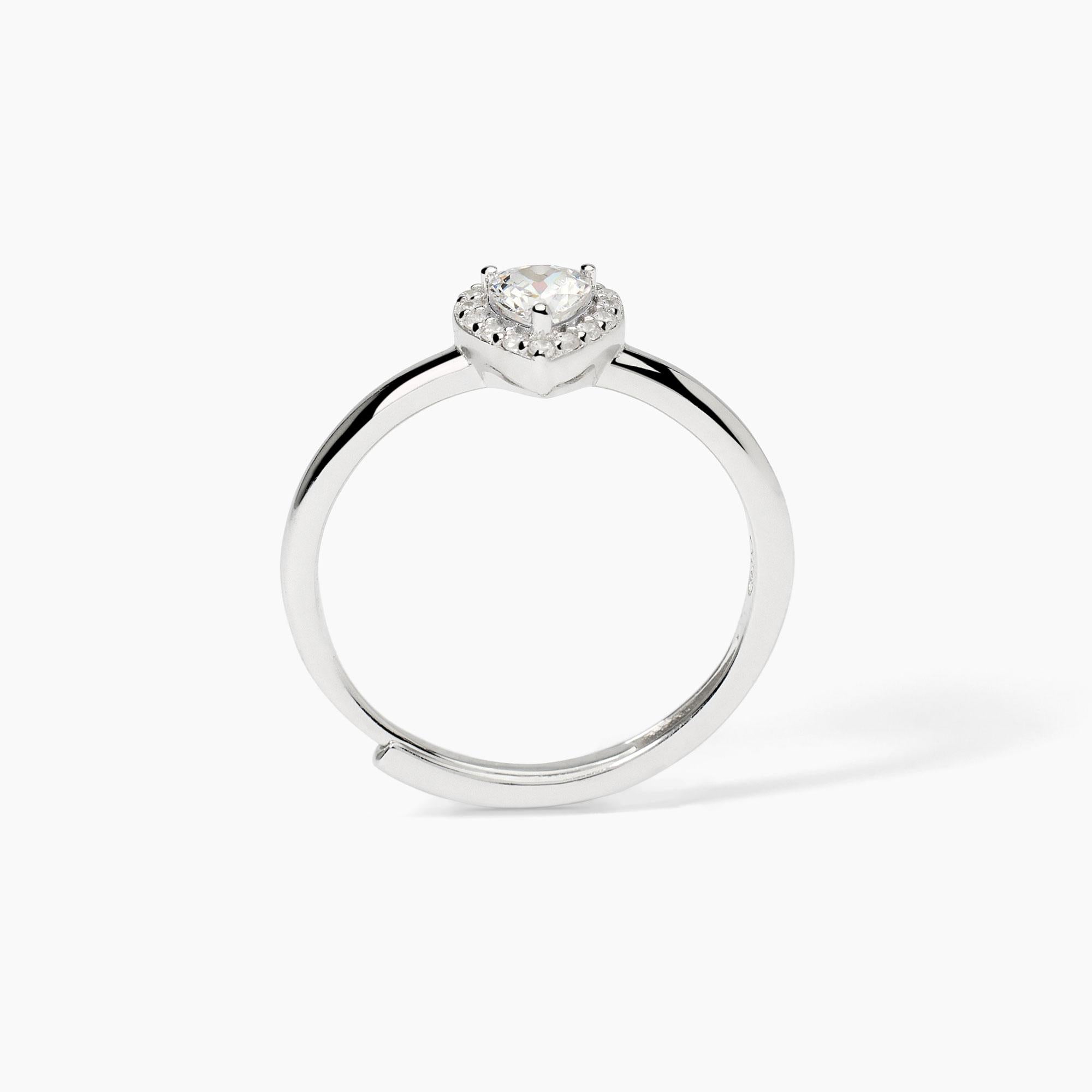 Anello da donna regolabile in argento rodiato con zircone bianco taglio cuore.