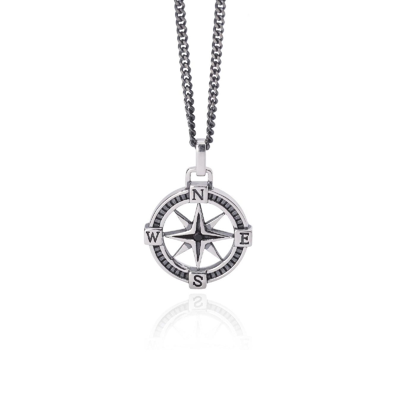 Collana con pendente della collezione Mabina Gioielli da uomo. Colore: argento e grigio. Collana in argento 925‰ brunito con catena groumette e ciondolo a forma di rosa dei venti con zircone nero centrale. Misura unica, lunghezza 50 cm con chiusura a moschettone.