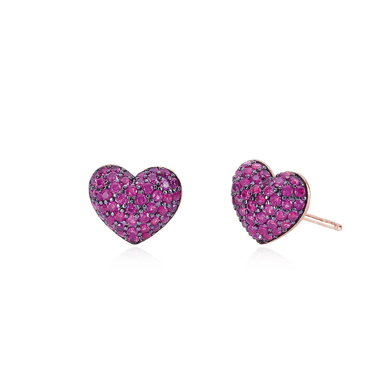 Orecchini lobo della collezione Mabina Gioielli da donna. Colore: oro rosa e fucsia. Orecchini in argento 925‰ rosati a cuore in pavé di rubini sintetici con griffe brunite. Dimensione dei cuori: 10,1 x 8,7 mm. Diametro dei rubini sintetici: 1,25 mm. Designed by Mabina in Italy.