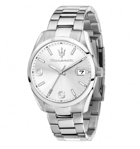 Quadrante analogico silver con indici a bastoni e numeri arabi, logo a ore 12 e datario a ore 3 con lente di ingrandimento.