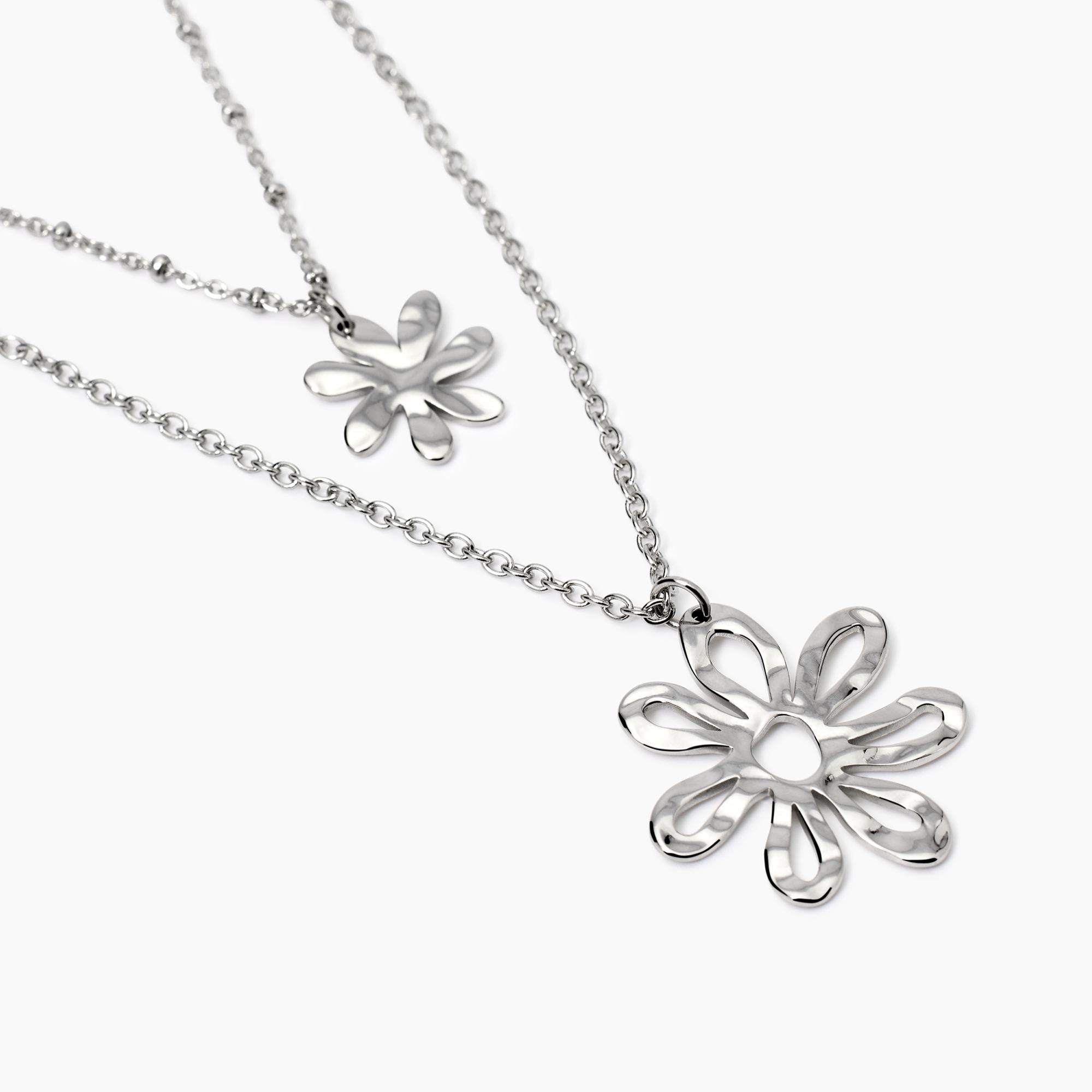 Girocollo con doppia catena rolò e pendenti fiore effetto martellato in acciaio.
